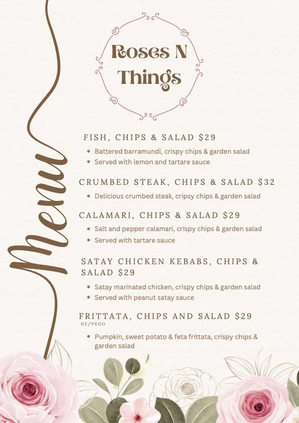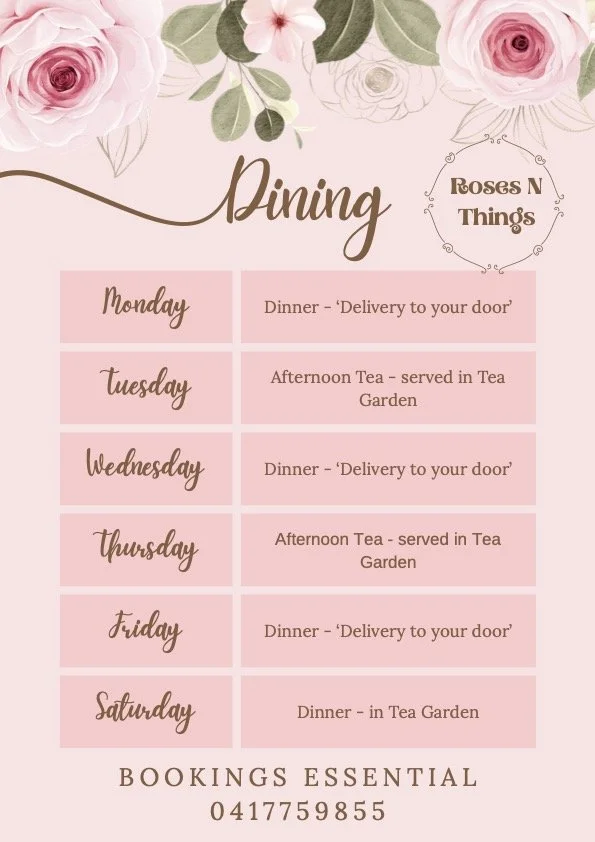 Dining is offered 6 days a week, in the garden or delivered to your caravan. Look below for our evening meal menu and our opening hours for dining . The evening meal menu is simple yet delicious. Reserve your dining experience upon booking or check in (call Lisa or Jason to book - 0417759855)